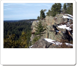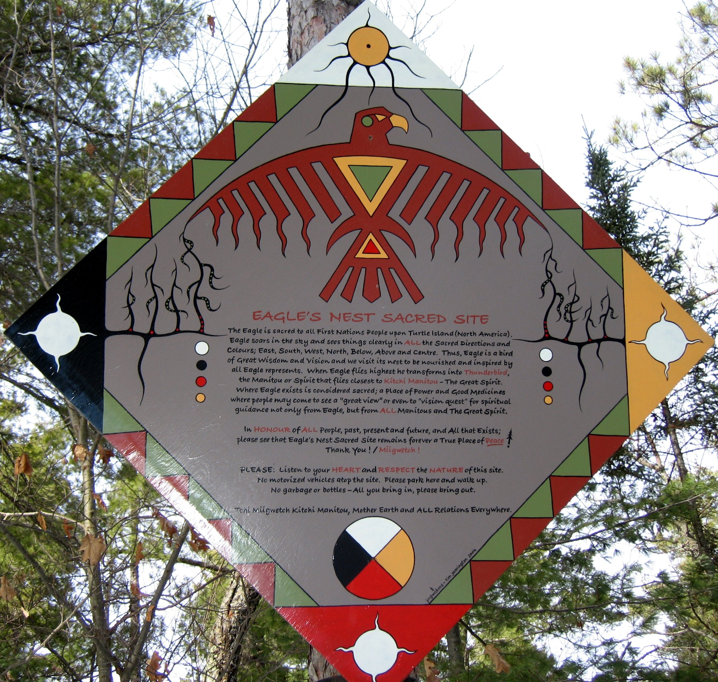 2.2Km West of Calabogie Peaks, on your left, you will note the Eagle's Nest trail sign marking the entrance to the trail. Follow the trail for about 20 minutes. Note the eagle's head, painted signs in the trees above you on the right. As you pass a pond on your left, look for a large, colourful and informative sign, just off to your right, that explains the cultural history of Eagles Nest. Follow the short trail up the hill to the right to the cliff site and enjoy the view. The 'eagles' were 'away' when we arrived, but great vistas.